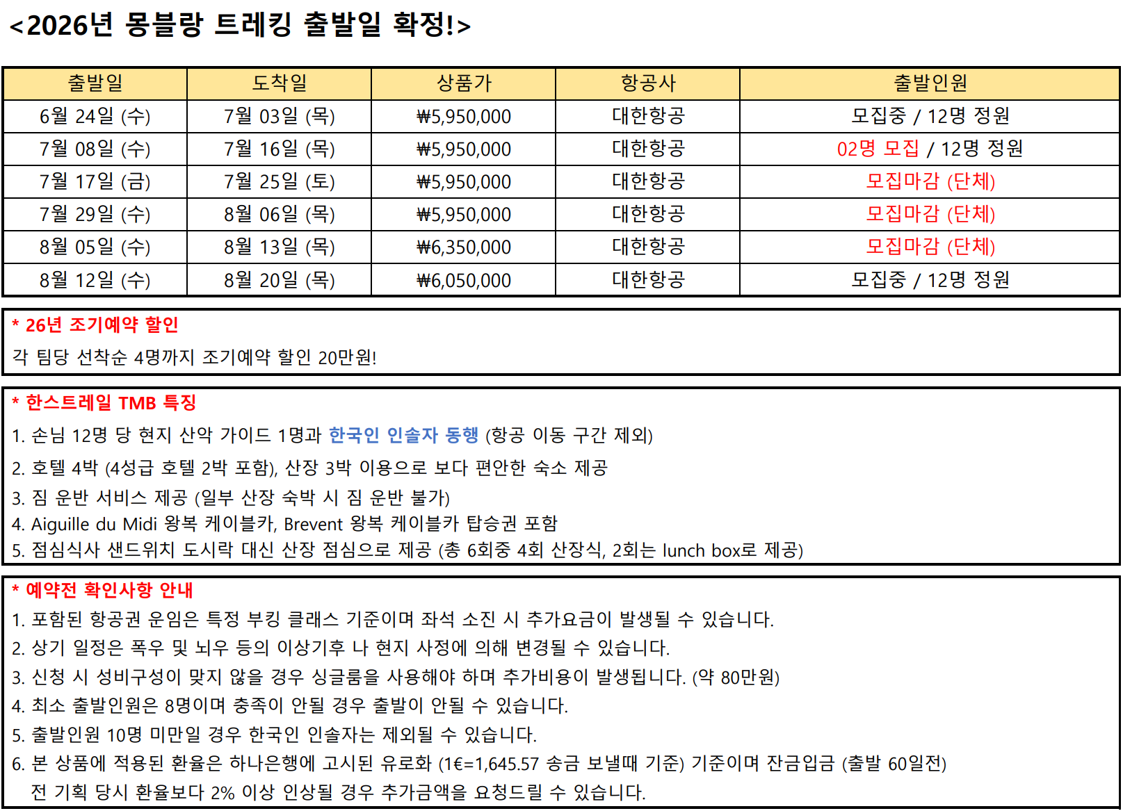 몽블랑 트래킹을 맞이하여 설렘반 걱정반으로 시작하였다 그러나 현지 가이드의 세심한 안전지도와 한스트레일 대표님의 무한 배려로 우리는 광활한 대자연과 이루 표현 할 수 없는 아름다운 풍경을 맘껏 만끽하면서 트래킹을 마쳤다 우리 총무님의 탁월한 여행사 선택에 찬사를 보내고 다음에도 트래킹을 한다면 한스트레일을 선택 할 것이다^^