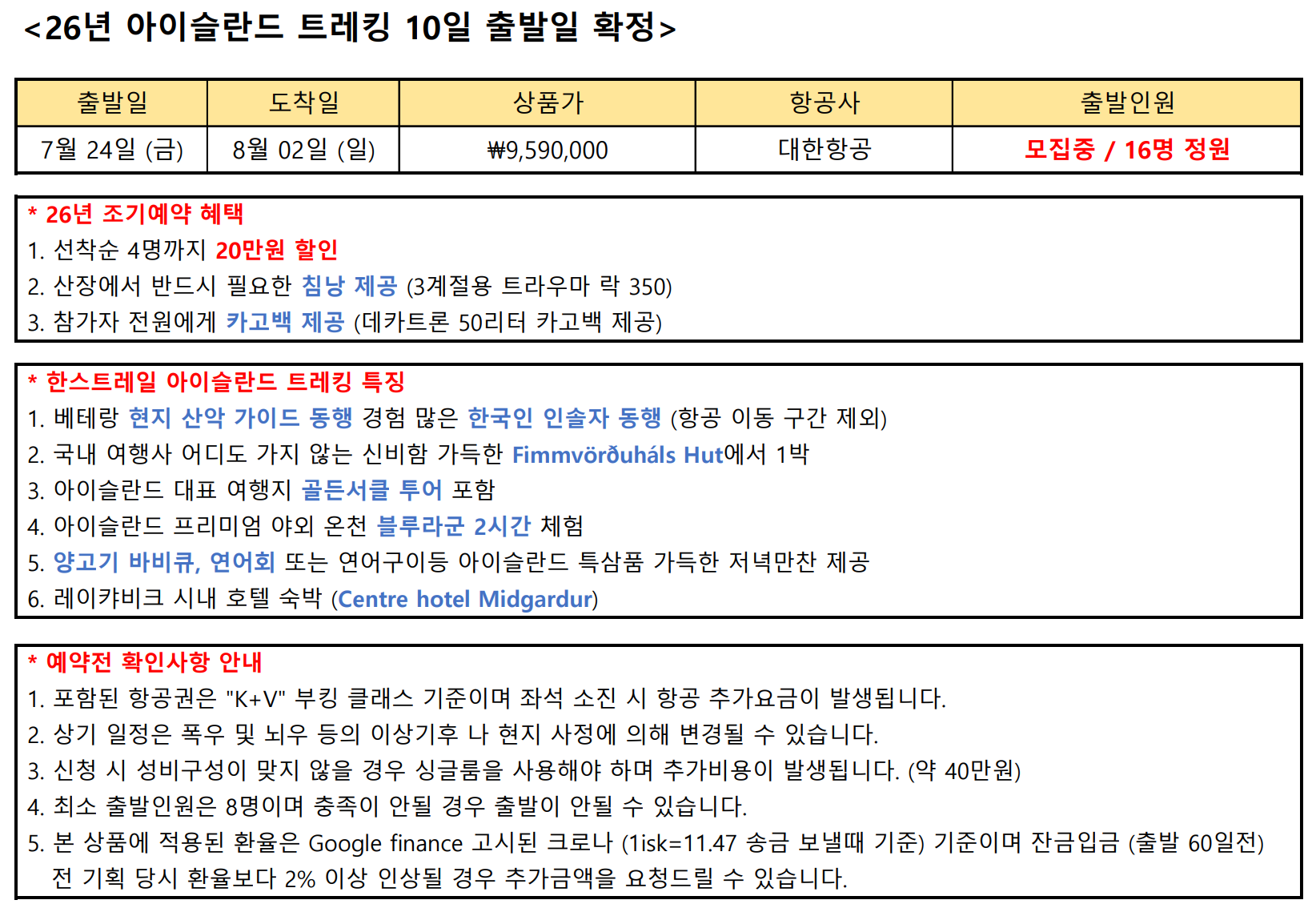 | Ⅰ. 본 아이슬란드 트레킹 상품은 한국인 인솔자의 동행하에 안전하게 진행되는 여행 프로그램이지만 개별행동이나 | ||||||